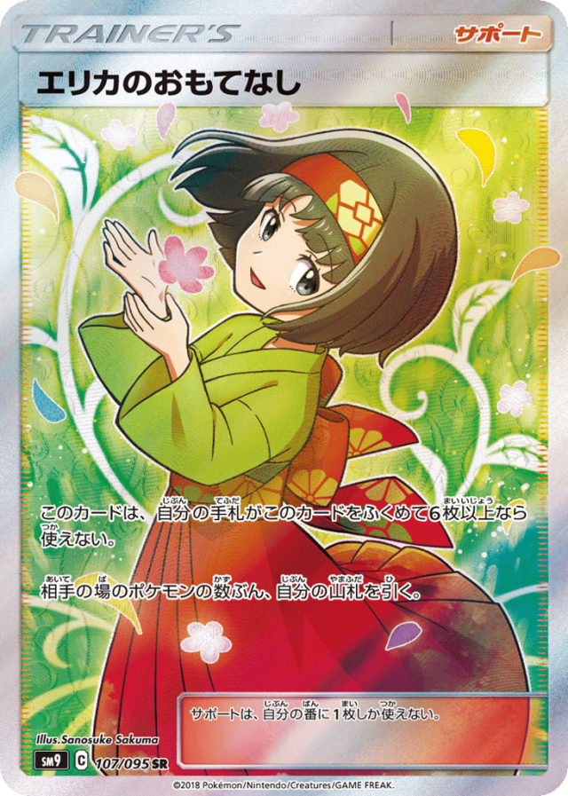 このカードは、自分の手札がこのカードをふくめて6枚以上なら使えない。 相手の場のポケモンの数ぶん、自分の山札を引く。 サポートは、自分の番に1枚しか使えない。
