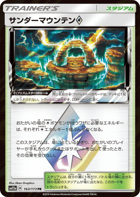 おたがいの場のElectricエネルギー1個ぶん少なくなる。 このスタジアムは、場に出ているかぎり、おたがいのプレイヤーが手札からグッズまたはサポートを出して使ったとき、その効果を受けない。 スタジアムは、自分の番に1枚だけ、バトル場の横に出せる。別の名前のスタジアムが場に出たなら、このカードをトラッシュする。