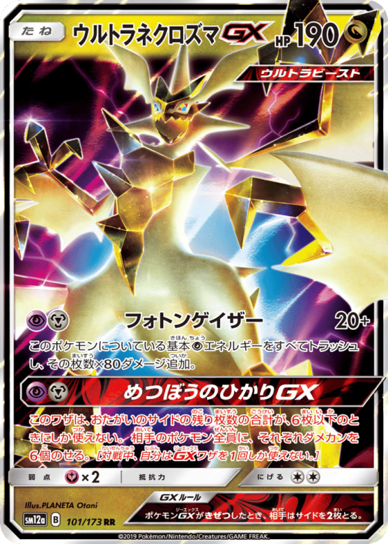 このワザは、おたがいのサイドの残り枚数の合計が、6枚以下のときにしか使えない。相手のポケモン全員に、それぞれダメカンを6個のせる。[対戦中、自分はGXワザを1回しか使えない。]