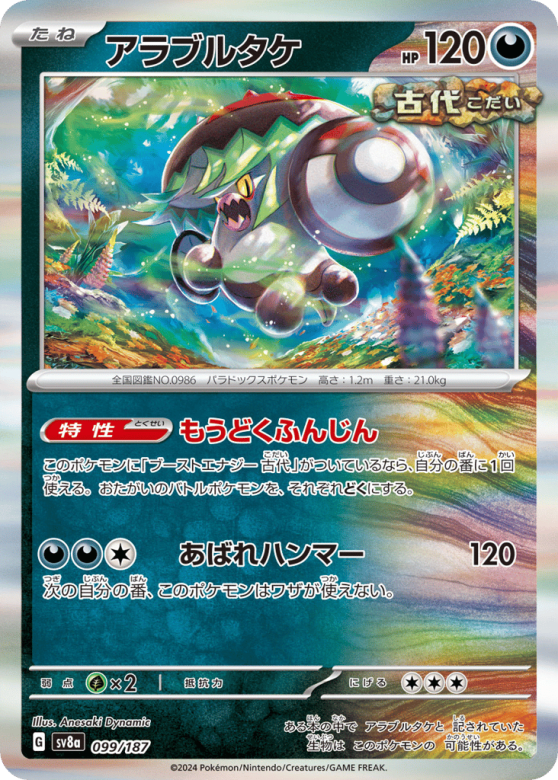 このポケモンに「ブーストエナジー 古代」がついているなら、自分の番に1回使える。おたがいのバトルポケモンを、それぞれどくにする。