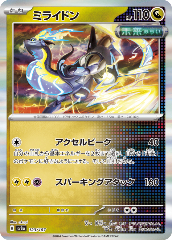 自分の山札から基本エネルギーを2枚まで選び、自分の「未来」のポケモンに好きなようにつける。そして山札を切る。
