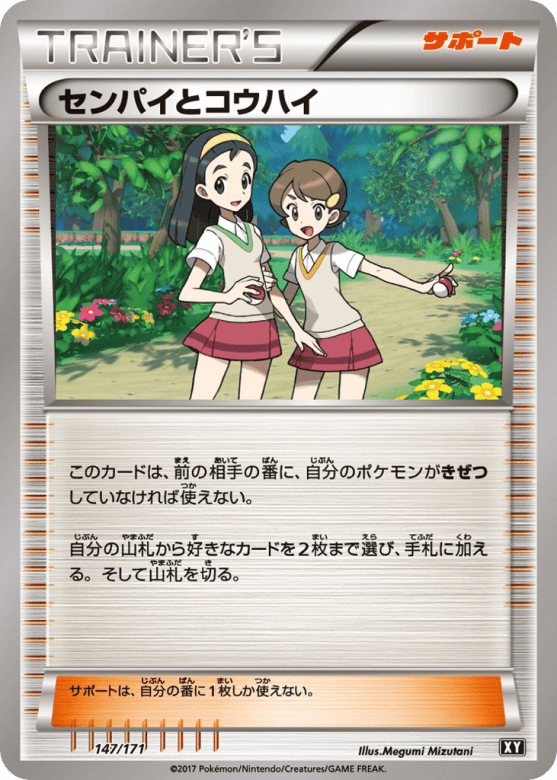 このカードは、前の相手の番に、自分のポケモンがきぜつしていなければ使えない。 自分の山札から好きなカードを2枚まで選び、手札に加える。そして山札を切る。 サポートは、自分の番に1枚しか使えない。