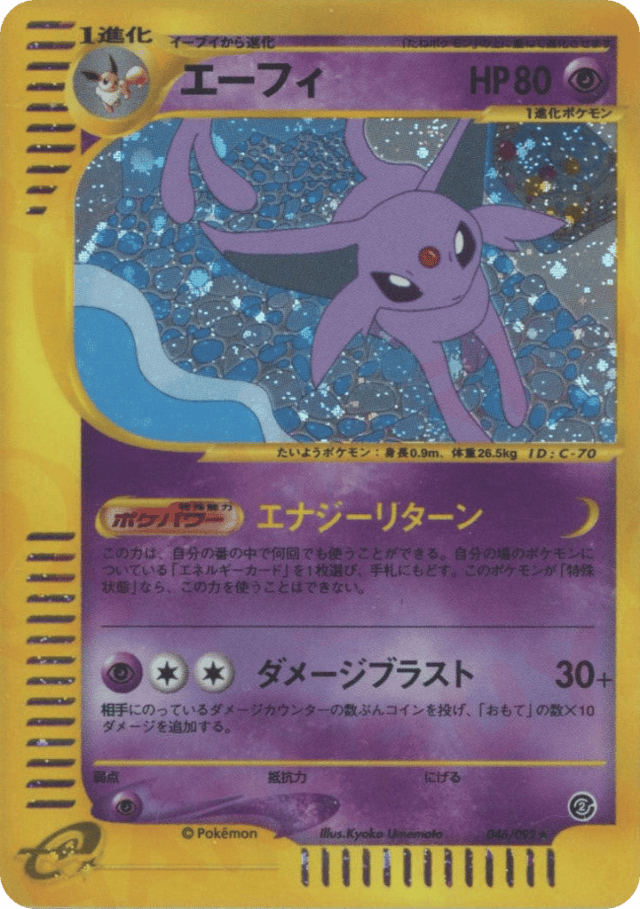 As often as you like during your turn (before your attack), choose an Energy card attached to 1 of your Pokémon and return it to your hand. This power can't be used if Espeon is affected by a Special Condition.