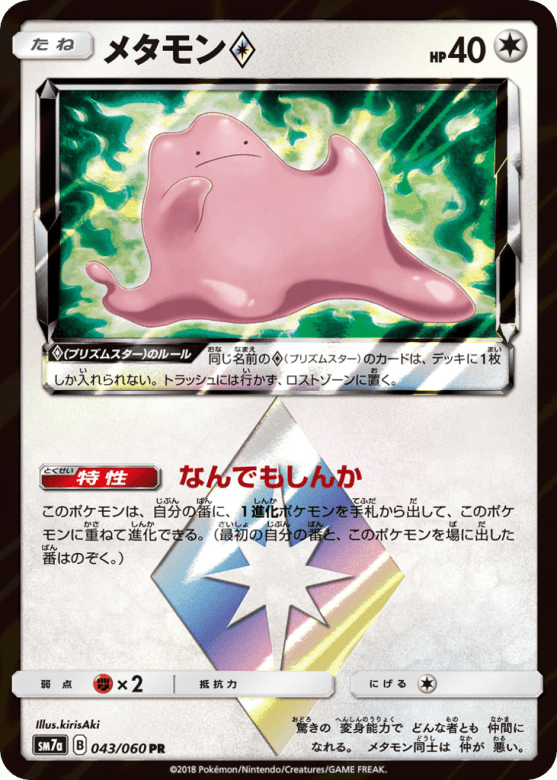 このポケモンは、自分の番に、1進化ポケモンを手札から出して、このポケモンに重ねて進化できる。(最初の自分の番と、このポケモンを場に出した番はのぞく。)