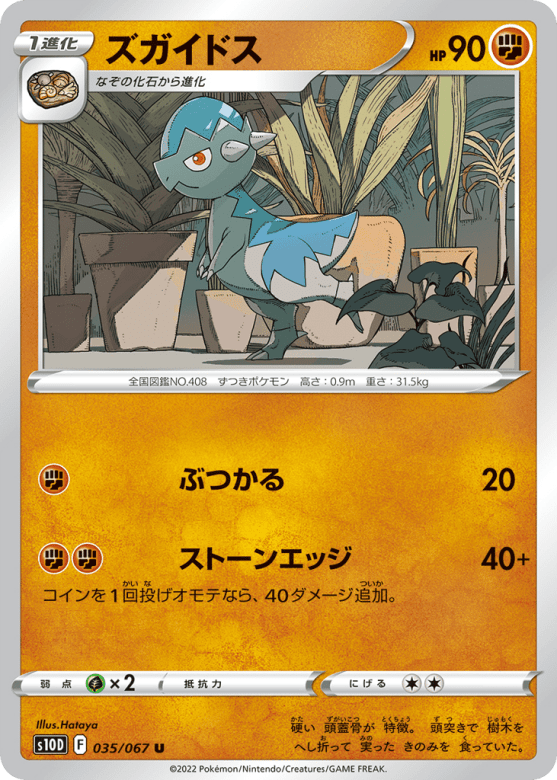 硬い 頭蓋骨が 特徴。 頭突きで 樹木を へし折って 実った きのみを 食っていた。