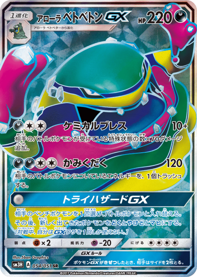 相手のベンチポケモンを1匹選び、バトルポケモンと入れ替える。その後、新しく出てきたポケモンをどくとやけどとマヒにする。[対戦中、自分はGXワザを1回しか使えない。]