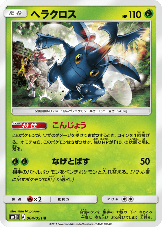 このポケモンが、ワザのダメージを受けてきぜつするとき、コインを1回投げる。オモテなら、このポケモンはきぜつせず、残りHPが「10」の状態で場に残る。