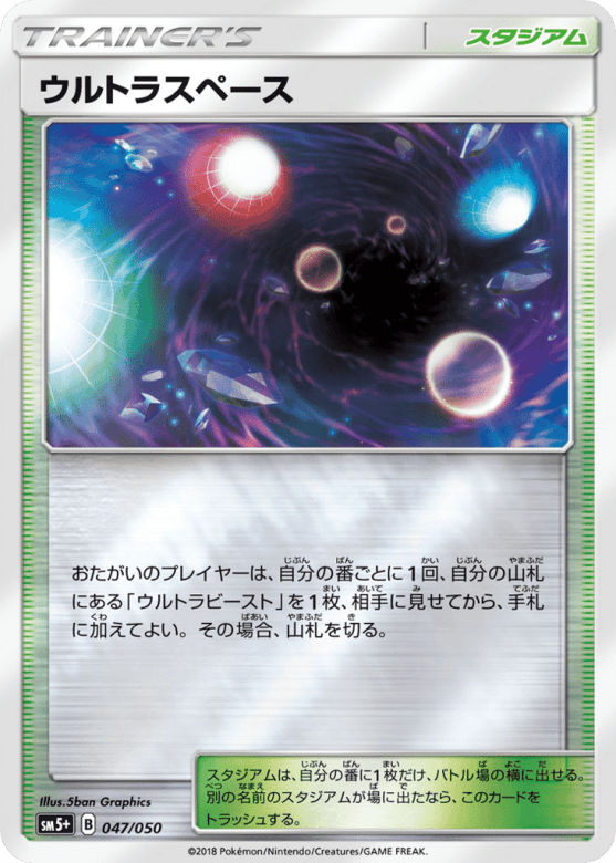 おたがいのプレイヤーは、自分の番ごとに1回、自分の山札にある「ウルトラビースト」を1枚、相手に見せてから、手札に加えてよい。その場合、山札を切る。 スタジアムは、自分の番に1枚だけ、バトル場の横に出せる。別の名前のスタジアムが場に出たなら、このカードをトラッシュする。