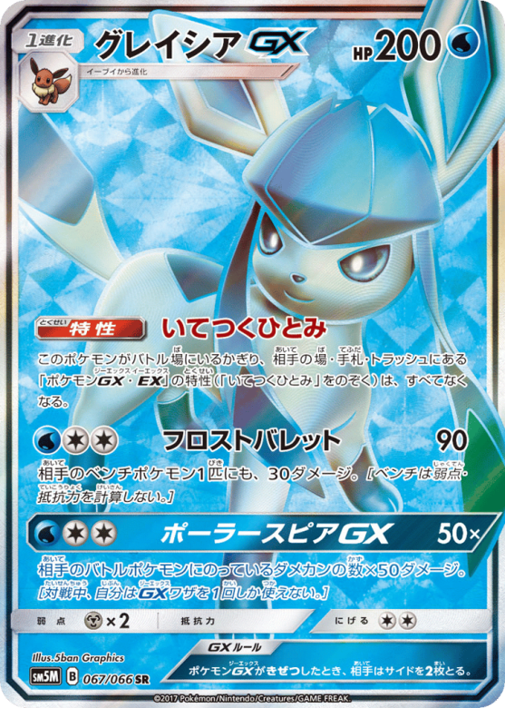このポケモンがバトル場にいるかぎり、相手の場・手札・トラッシュにある「ポケモンGX・EX」の特性(「いてつくひとみ」をのぞく)は、すべてなくなる。