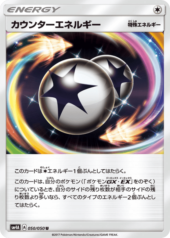 このカードはColorlessエネルギー1個ぶんとしてはたらく。 このカードは、自分のポケモン(「ポケモンGX・EX」をのぞく)についているとき、自分のサイドの残り枚数が相手のサイドの残り枚数より多いなら、すべてのタイプのエネルギー2個ぶんとしてはたらく。