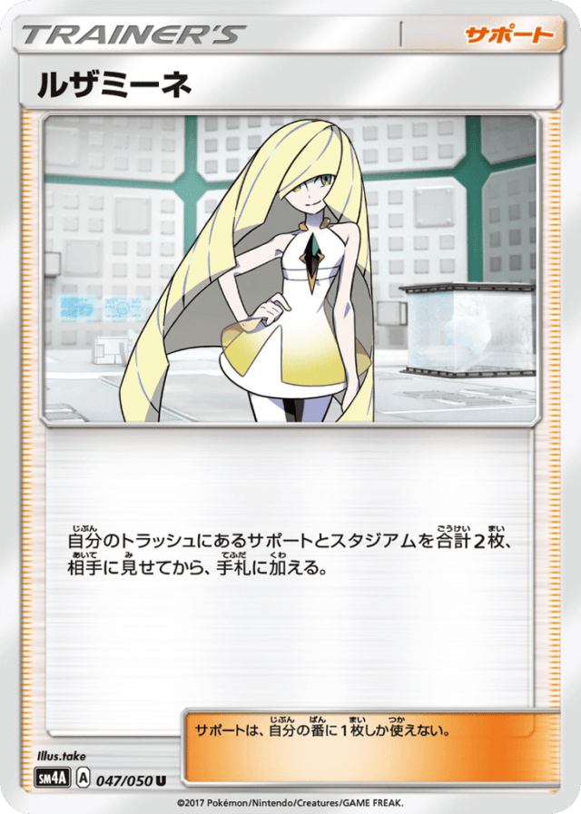 自分のトラッシュにあるサポートとスタジアムを合計2枚、相手に見せてから、手札に加える。 サポートは、自分の番に1枚しか使えない。