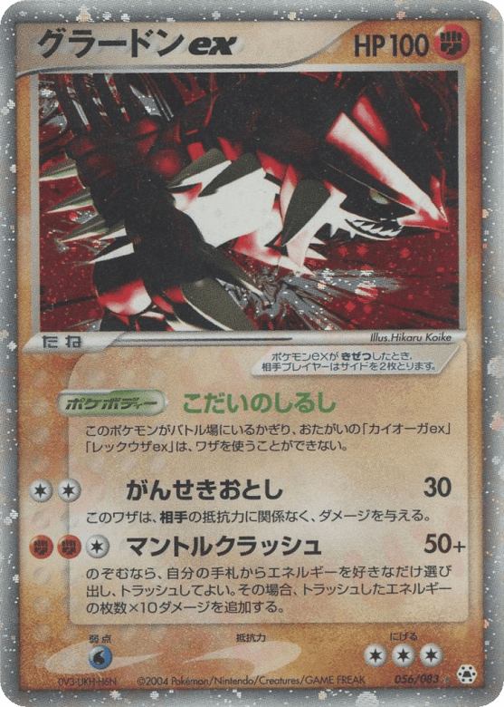 As long as Groudon ex is your Active Pokémon, each player's Kyogre ex and Rayquaza ex can't attack.