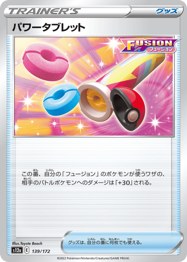 この番、自分の「フュージョン」のポケモンが使うワザの、相手のバトルポケモンへのダメージは「+30」される。 グッズは、自分の番に何枚でも使える。
