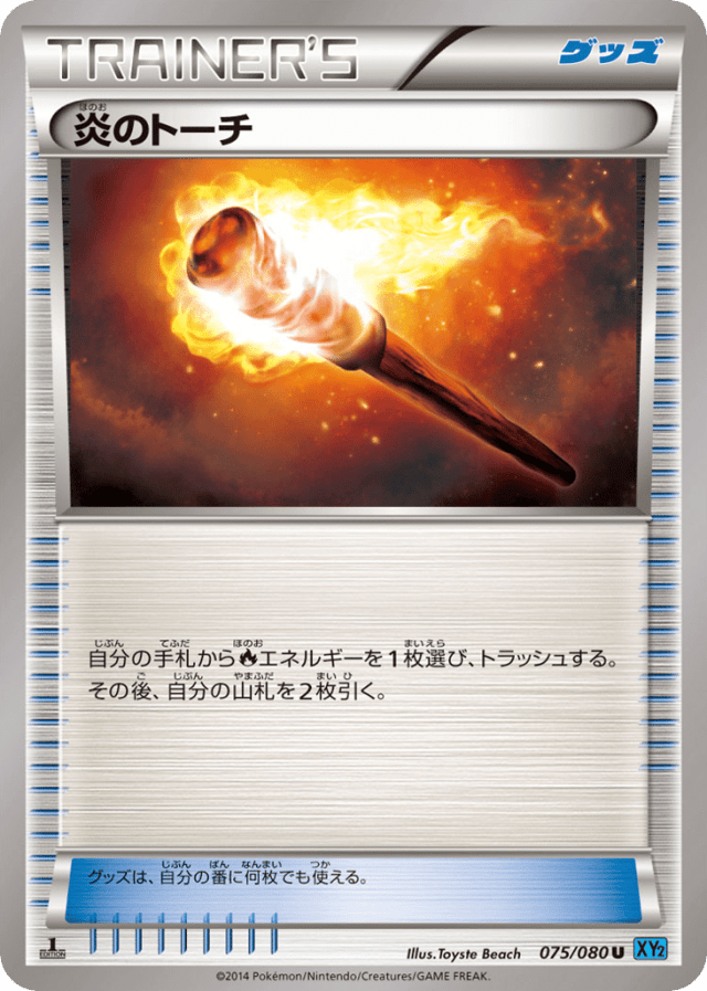 自分の手札からFireエネルギーを1枚選び、トラッシュする。その後、自分の山札を2枚引く。 グッズは、自分の番に何枚でも使える。
