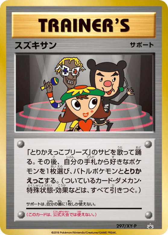 「とりかえっこプリーズ」のサビを歌って踊る。その後、自分の手札から好きなポケモンを1枚選び、バトルポケモンととりかえっこする。(ついているカード・ダメカン・特殊状態・効果などは、すべて引きつぐ。) サポートは、自分の番に1枚しか使えない。