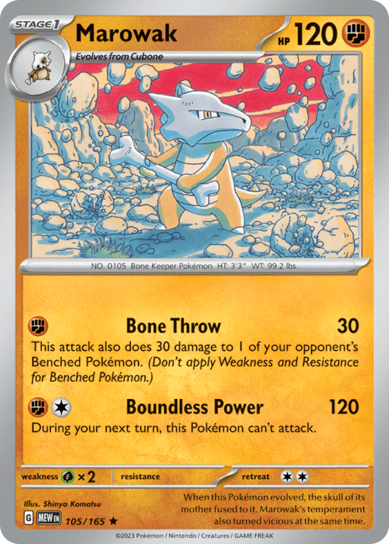 When this Pokémon evolved, the skull of its mother fused to it. Marowak's temperament also turned vicious at the same time.