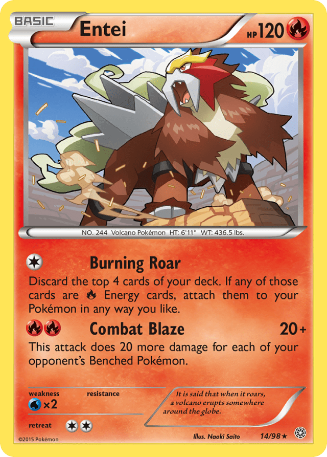 Discard the top 4 cards of your deck. If any of those cards are Fire Energy cards, attach them to your Pokémon in any way you like.