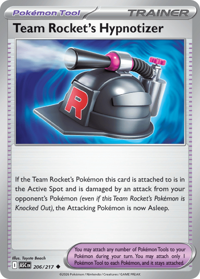 If the Team Rocket's Pokémon this card is attached to is in the Active Spot and is damaged by an attack from your opponent's Pokémon (even if this Team Rocket's Pokémon is Knocked Out), the Attacking Pokémon is now Asleep. You may attach any number of Pokémon Tools to your Pokémon during your turn. You may attach only 1 Pokémon Tool to each Pokémon, and it stays attached.