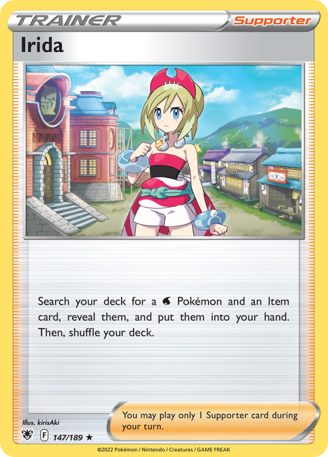 Search your deck for a Water Pokémon and an Item card, reveal them, and put them into your hand. Then, shuffle your deck. You may play only 1 Supporter card during your turn.