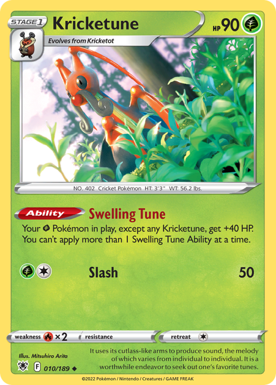 Your Grass Pokémon in play, except any Kricketune, get +40 HP. You can't apply more than 1 Swelling Tune Ability at a time.