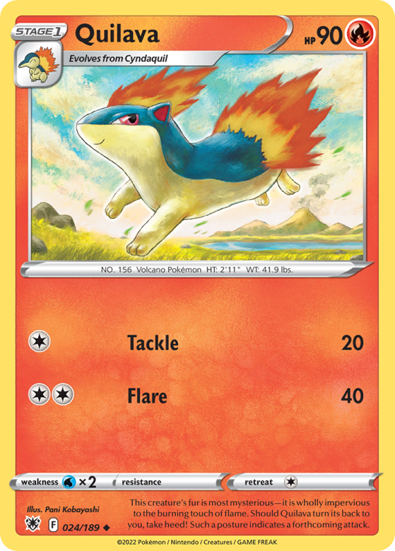 This creature's fur is most mysterious—it is wholly impervious to the burning touch of flame. Should Quilava turn its back to you, take heed! Such a posture indicates a forthcoming attack.