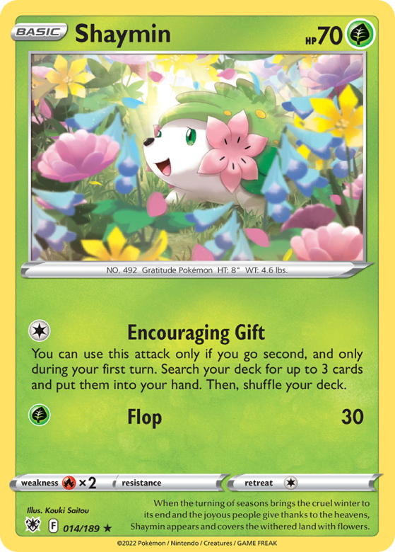 When the turning of seasons brings the cruel winter to its end and the joyous people give thanks to the heavens, Shaymin appears and covers the withered land with flowers.
