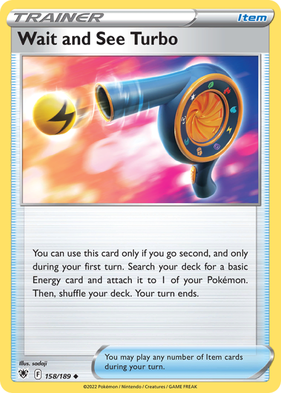 You can use this card only if you go second, and only during your first turn. Search your deck for a basic Energy card and attach it to 1 of your Pokémon. Then, shuffle your deck. Your turn ends. You may play any number of Item cards during your turn.