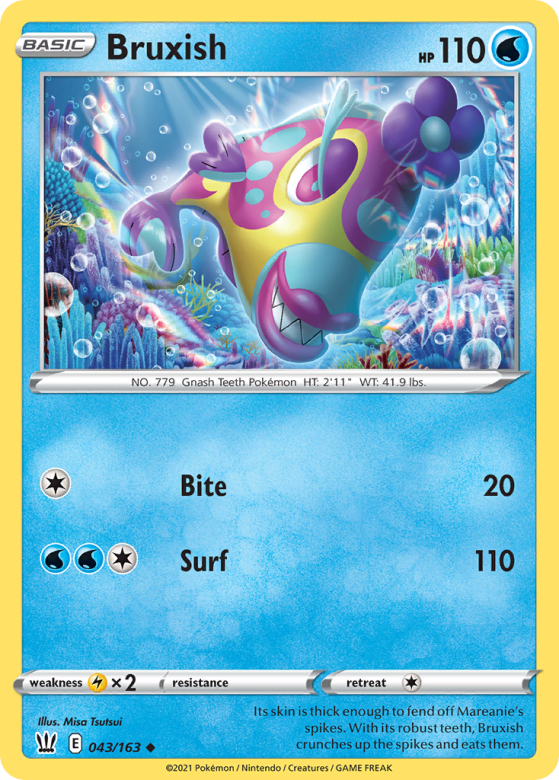 Its skin is thick enough to fend off Mareanie's spikes. With its robust teeth, Bruxish crunches up the spikes and eats them.