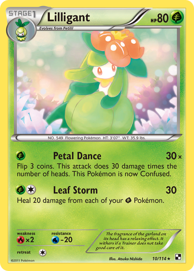 The fragrance of the garland on its head has a relaxing effect. It withers if a Trainer does not take good care of it.