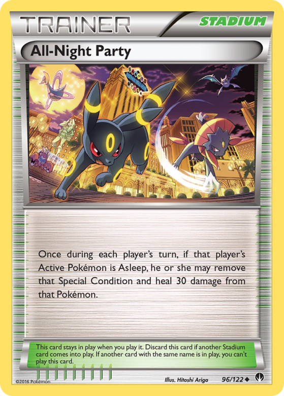 Once during each player's turn, if that player's Active Pokémon is Asleep, he or she may remove that Special Condition and heal 30 damage from that Pokémon. This card stays in play when you play it. Discard this card if another Stadium card comes into play. If another card with the same name is in play, you can't play this card.