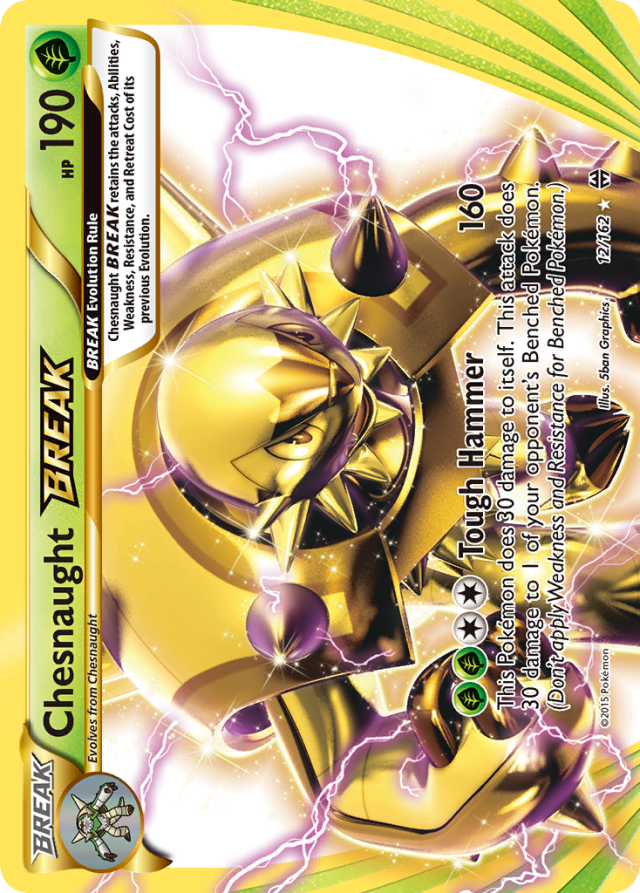 BREAK Evolution Rule: Chesnaught BREAK retains the attacks, Abilities, Weakness, Resistance, and Retreat Cost of its previous Evolution.