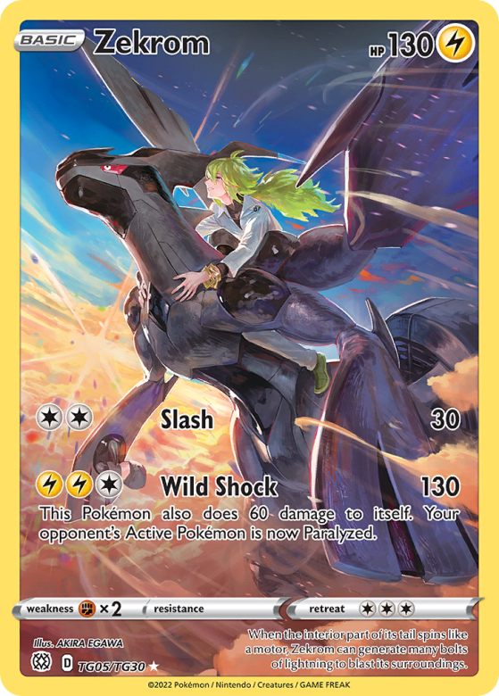 When the interior part of its tail spins like a motor, Zekrom can generate many bolts of lightning to blast its surroundings.