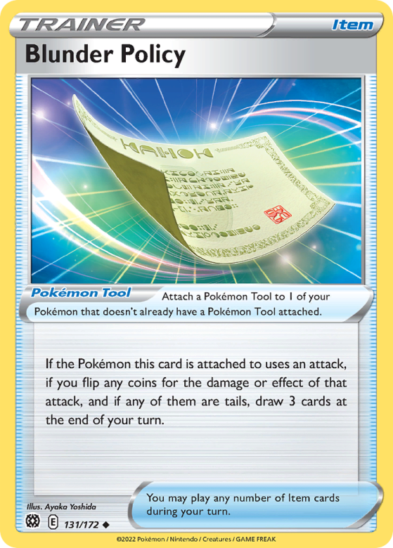 If the Pokémon this card is attached to uses an attack, if you flip any coins for the damage or effect of that attack, and if any of them are tails, draw 3 cards at the end of your turn. You may play any number of Item cards during your turn. Attach a Pokémon Tool to 1 of your Pokémon that doesn't already have a Pokémon Tool attached.