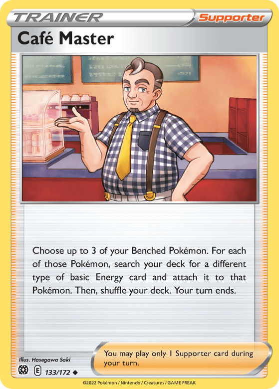 Choose up to 3 of your Benched Pokémon. For each of those Pokémon, search your deck for a different type of basic Energy card and attach it to that Pokémon. Then, shuffle your deck. Your turn ends. You may play only 1 Supporter card during your turn.