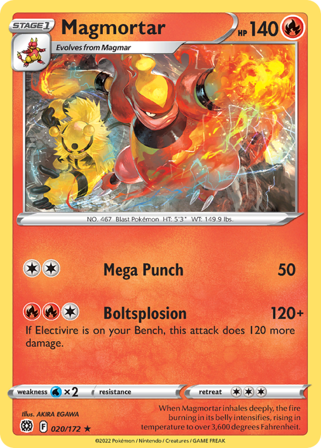 When Magmortar inhales deeply, the fire burning in its belly intensifies, rising in temperature to over 3,600 degrees Fahrenheit.