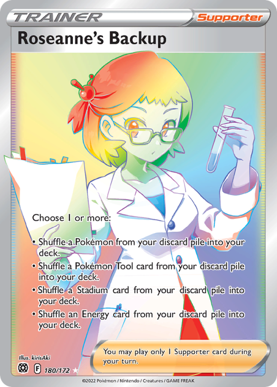 Choose 1 or more: • Shuffle a Pokémon from your discard pile into your deck. • Shuffle a Pokémon Tool card from your discard pile into your deck. • Shuffle a Stadium card from your discard pile into your deck. • Shuffle an Energy card from your discard pile into your deck. You may play only 1 Supporter card during your turn.