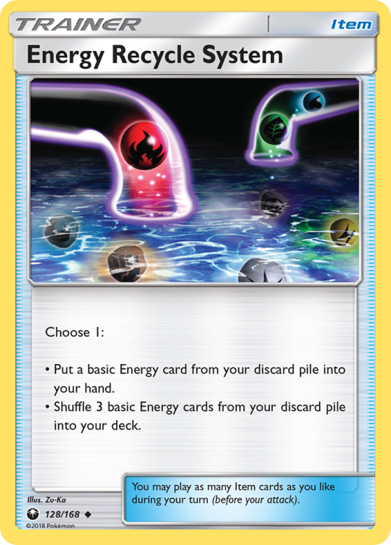 Choose 1: • Put a basic Energy card from your discard pile into your hand. • Shuffle 3 basic Energy cards from your discard pile into your deck. You may play as many Item cards as you like during your turn (before your attack).