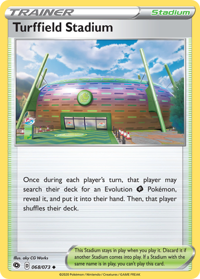 Once during each player's turn, that player may search their deck for an Evolution Grass Pokémon, reveal it, and put it into their hand. Then, that player shuffles their deck. This Stadium stays in play when you play it. Discard it if another Stadium comes into play. If a Stadium with the same name is in play, you can't play this card.