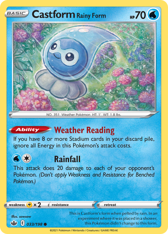 This is Castform's form when pelted by rain. In an experiment where it was placed in a shower, this Pokémon didn't change to this form.