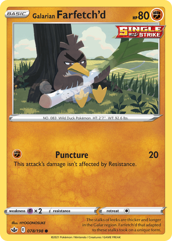 The stalks of leeks are thicker and longer in the Galar region. Farfetch'd that adapted to these stalks took on a unique form.