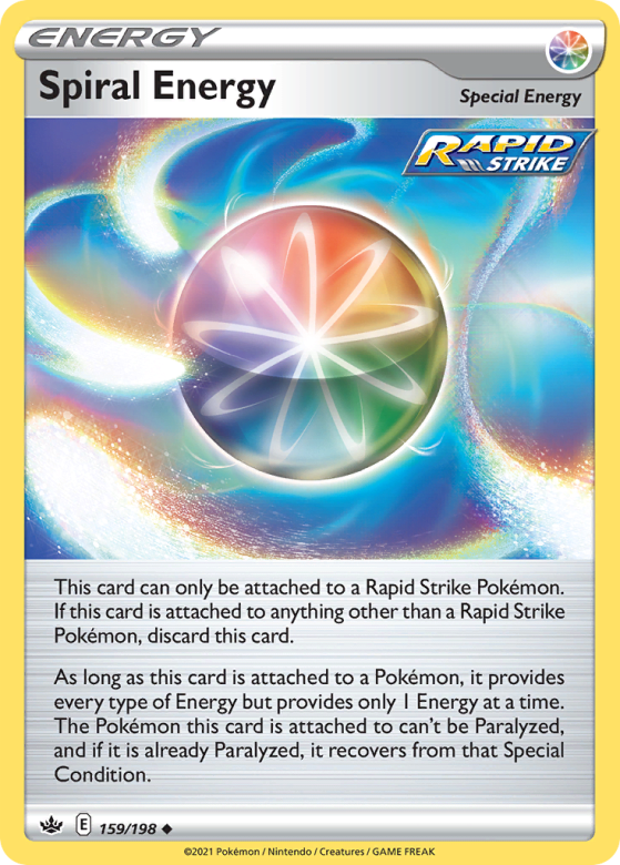 This card can only be attached to a Rapid Strike Pokémon. If this card is attached to anything other than a Rapid Strike Pokémon, discard this card. As long as this card is attached to a Pokémon, it provides every type of Energy but provides only 1 Energy at a time. The Pokémon this card is attached to can't be Paralyzed, and if it is already Paralyzed, it recovers from that Special Condition.
