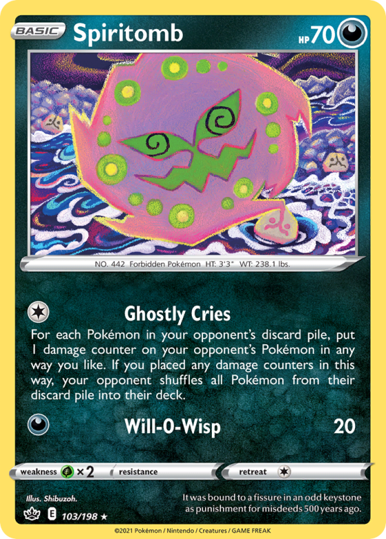 For each Pokémon in your opponent's discard pile, put 1 damage counter on your opponent's Pokémon in any way you like. If you placed any damage counters in this way, your opponent shuffles all Pokémon from their discard pile into their deck.