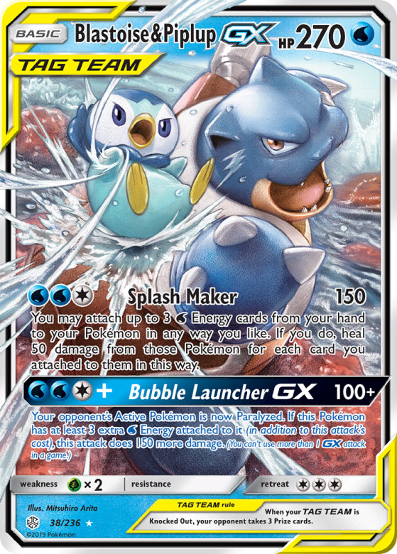 Your opponent's Active Pokémon is now Paralyzed. If this Pokémon has at least 3 extra Water Energy attached to it (in addition to this attack's cost), this attack does 150 more damage. (You can't use more than 1 GX attack in a game.)
