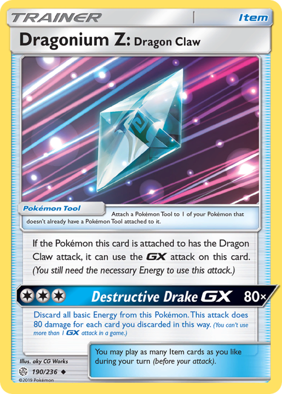 Attach a Pokémon Tool to 1 of your Pokémon that doesn't already have a Pokémon Tool attached to it. If the Pokémon this card is attached to has the Dragon Claw attack, it can use the GX attack on this card. (You still need the necessary Energy to use this attack.) You may play as many Item cards as you like during your turn (before your attack).