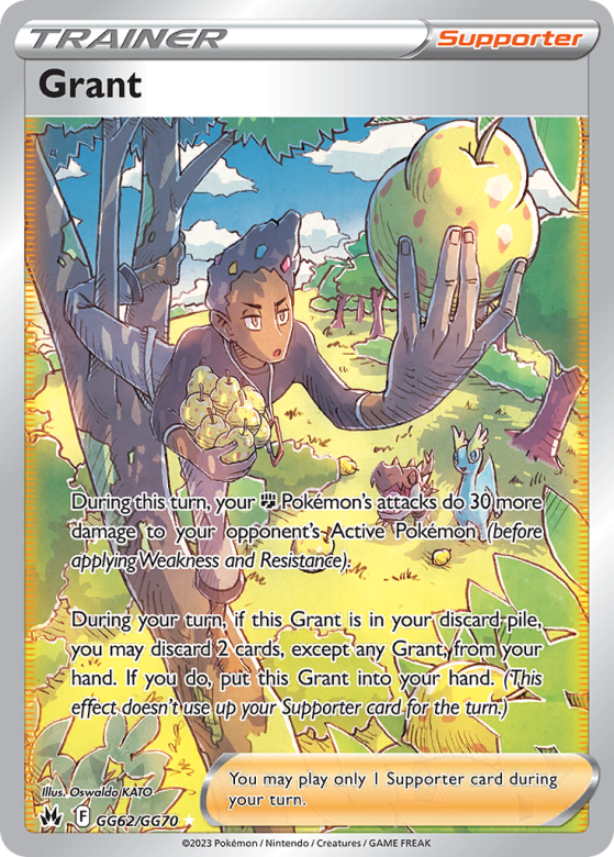During this turn, your Fighting Pokémon's attacks do 30 more damage to your opponent's Active Pokémon (before applying Weakness and Resistance). During your turn, if this Grant is in your discard pile, you may discard 2 cards, except any Grant, from your hand. If you do, put this Grant into your hand. (This effect doesn't use up your Supporter card for the turn.) You may play only 1 Supporter card during your turn.