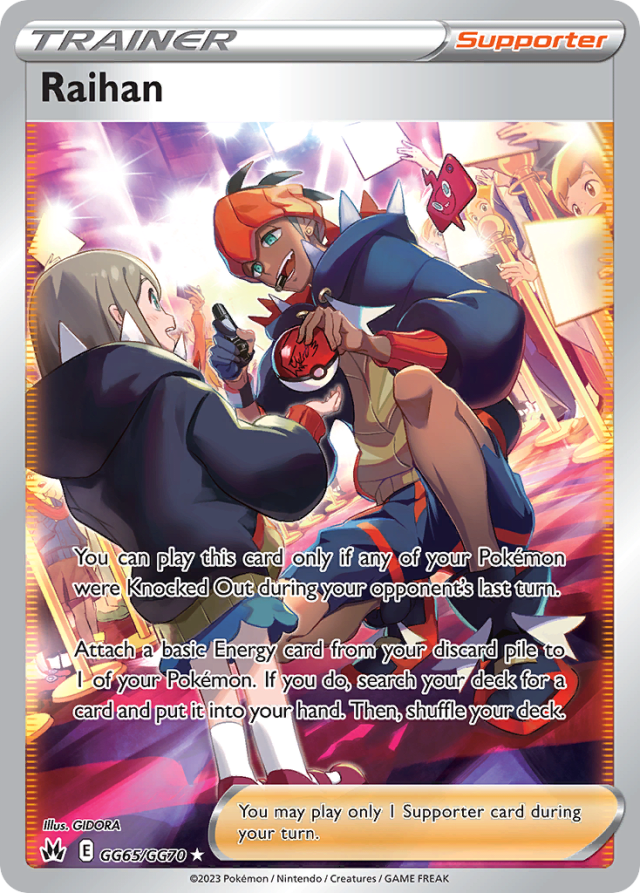 You can play this card only if any of your Pokémon were Knocked Out during your opponent's last turn. Attach a basic Energy card from your discard pile to 1 of your Pokémon. If you do, search your deck for a card and put it into your hand. Then, shuffle your deck. You may play only 1 Supporter card during your turn.