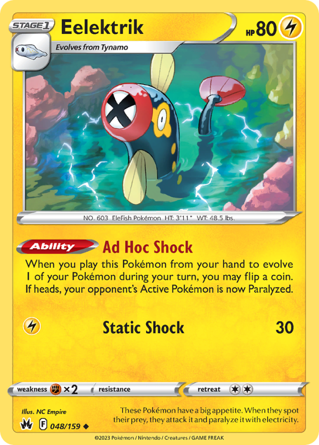 When you play this Pokémon from your hand to evolve 1 of your Pokémon during your turn, you may flip a coin. If heads, your opponent's Active Pokémon is now Paralyzed.