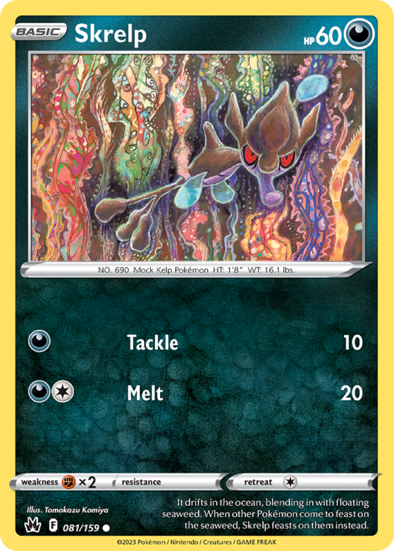 It drifts in the ocean, blending in with floating seaweed. When other Pokémon come to feast on the seaweed, Skrelp feasts on them instead.