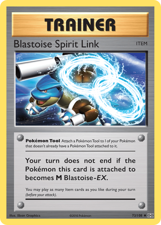 Attach a Pokémon Tool to 1 of your Pokémon that doesn't already have a Pokémon Tool attached to it. Your turn does not end if the Pokémon this card is attached to becomes M Blastoise-EX. You may play as many Item cards as you like during your turn (before your attack).