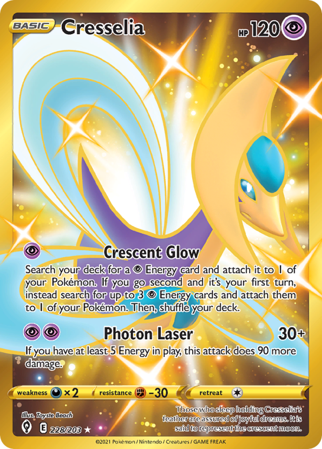 Those who sleep holding Cresselia's feather are assured of joyful dreams. It is said to represent the crescent moon.